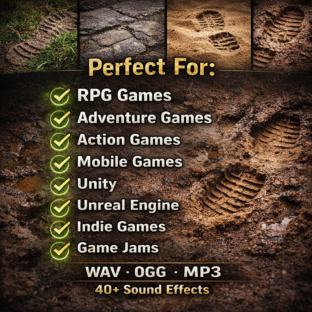 A high quality collection of footstep sound effects designed for games, RPGs, adventure games and game development projects.