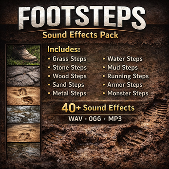 This pack includes footsteps on grass, stone, wood, sand, metal, water, mud, running steps, armor steps and monster steps ready to use in your game.