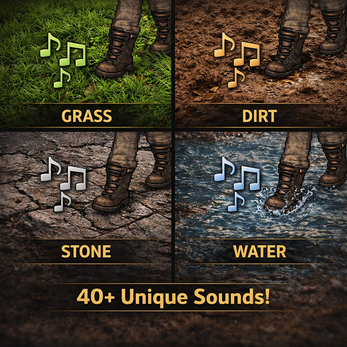 This pack includes footsteps on multiple surfaces like grass, stone, wood, sand, metal, water and mud.